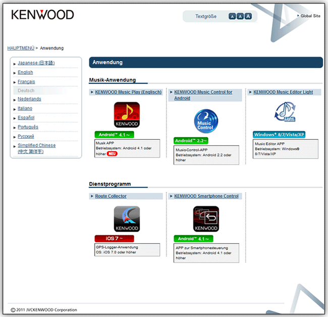 Kenwoods "Music Control App" wird benötigt. (wie schon 2012/2013)