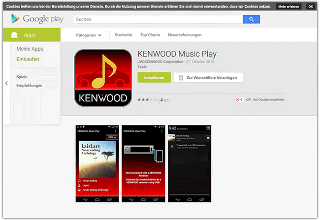 2. Die App ist kostenlos im Google Play Store erhältlich: https://play.google.com/store/apps/details?id=com.jvckenwood.ao2.kenwood.musicplay&hl=de 3. Nach der Installation kann die Musik wiedergegeben und die Funktionen über das Autoradio gesteuert werden. 4. Im Browse-Mode kann man keine Musik über das Smartphone suchen.
