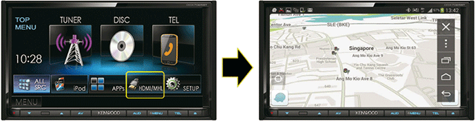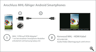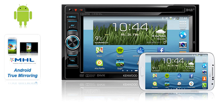 Viele Kenwood Moniceiver und Navitainer verfügen über die HDMI/MHL-Schnittstelle, die zur Kabelverbindung mit den MHL-fähigen Smartphones benötigt wird.