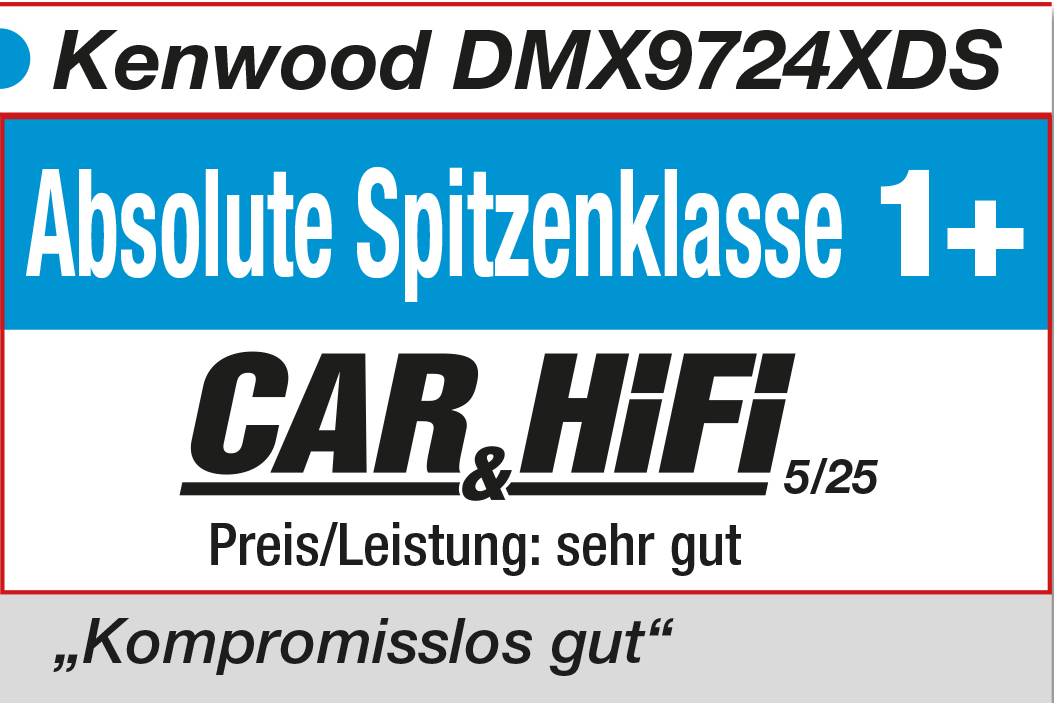 "Das Kenwood DMX9724XDS setzt in jeder Hinsicht Maßstäbe: Klang und Bild sind spitze, Ausstattung umfassend, Konnektivität per Kabel und drahtlos vorbildlich. Zudem ist die Bedienung mit großem Drehregler, HardKeys und grafisch ebenso gelungener wie funktionaler Bildschirmdarstellung gut und sicher gelöst. Der beste von uns je getestete Moniceiver!“