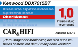 „Gerade erst stürmte Kenwood mit dem DDX5015DAB (Test in CAR&HIFI 5/2015) den Spitzenplatz in der Oberklasse unserer Bestenliste. Jetzt legen die Japaner mit dem DDX7015BT nach. Wie der Wegfall der Buchstaben „DAB“ in der Namensgebung bereits verrät, verzichtet der „große“ DDX7015BT leider auf den integrierten Digitalradio- Empfänger. Dafür bietet er gegenüber dem DDX5015DAB das größere, formatfüllende Display. Dieses fährt auf Knopfdruck herunter und gibt so den Zugriff auf das CD/DVD-Laufwerk frei. Der Display-Winkel lässt sich in sieben Positionen einstellen, so dass auch bei tief sitzenden Einbauplätzen optimale Ablesbarkeit gegeben ist. Die übrigen Funktionen und die Technik entsprechen denen des DDX5015DAB, was ein Blick auf Ausstattung und Messwerte schnell verrät. Auch hier ist also das komplette Multimedia-Programm, Bluetooth, Smartphone-Konnektivität und ein DSP zur Klangoptimierung an Bord. (…)