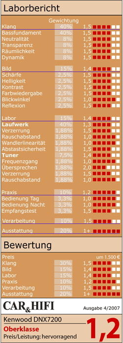 "Der Kenwood DNX7200 vereint DVD-Entertainment, Radio und Navigation in einem Gerät. (...) So wundert es nicht, dass auch das Kenwood eine hervorragende, benutzerfreundliche und absolut zuverlässige Navigation bietet. Die Qualität und Geschwindigkeit der GPS-Positionierung ist mittlerweile so hoch, dass man das Fehlen eines Speed-Pulse-Anschlusses eigentlich nur in Tunneln bemerkt. Die Bedienung der Garmin-Software über den fast 7 Zoll großen Touchscreen ist einfach ein Genuss. Endlich einmal Schaltflächen, die wirklich groß genug und auch bei der Fahrt über unebene Strecken sicher zu treffen sind. (...)
