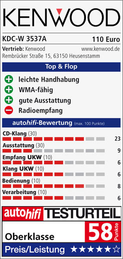 (….) Die Kenwood-Zwillinge (KDC-W3537A und KDC-W4037A) sind wertig aufgemacht und lassen sich toll bedienen. Mit dem Joystick schaltet man sich schnell durch Ordner und Titel, die Tasten sind groß, das Display ist erfreulich kontrastreich.