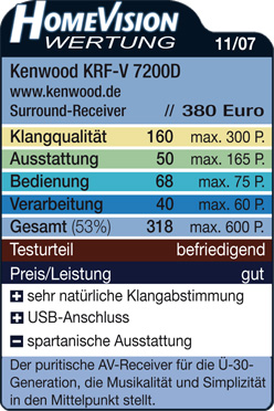 (...) Wer aber in erster Linie auf bestmögliche Musikwiedergabe in dieser Klasse schaut und das übliche überdimensionale Heimkino-Gemetzel durch dezenten Raumklang ersetzen will, sollte eher zum KRF-V7200D greifen, denn sein feinzeichnender, besonders farbenprächtiger Klang geht einfach mehr unter die Haut. Erste Wahl für die akustischen Instrumenten und Filmen mit Handlung zugeneigte Ü-30-Generation, die für diese Mischung gerne 30 Euro mehr hinblättern."