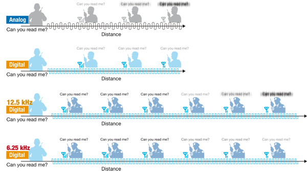 Da die HF-Signalstärke mit wachsender Entfernung sinkt, wird der Empfang analoger Signale zunehmend verrauscht oder sogar unterbrochen. Die niedrige BER (Bit Error Rate) von NXDN verbessert den Empfang in den Randzonen, wobei das abgedeckte Gebiet im Vergleich zu Analog-FM mehr als 20 % größer ist, bei 6,25 kHz digital Bandbreite sogar um 50 %. Selbst in Relation zum 12,5-kHz-Digitalbetrieb, wie beispielsweise DMR, führt die FDMA-Technologie von NXDN durch die schmalere Band-breite von 6,25 kHz zu einer 15 % größeren Reichweite. Da die Empfänger mit schmaleren Filtern ausgestattet sind, wird das Rauschen reduziert und im Endresultat wird 30 % größere Ge-bietsabdeckung bei bester Verständlichkeit erreicht.