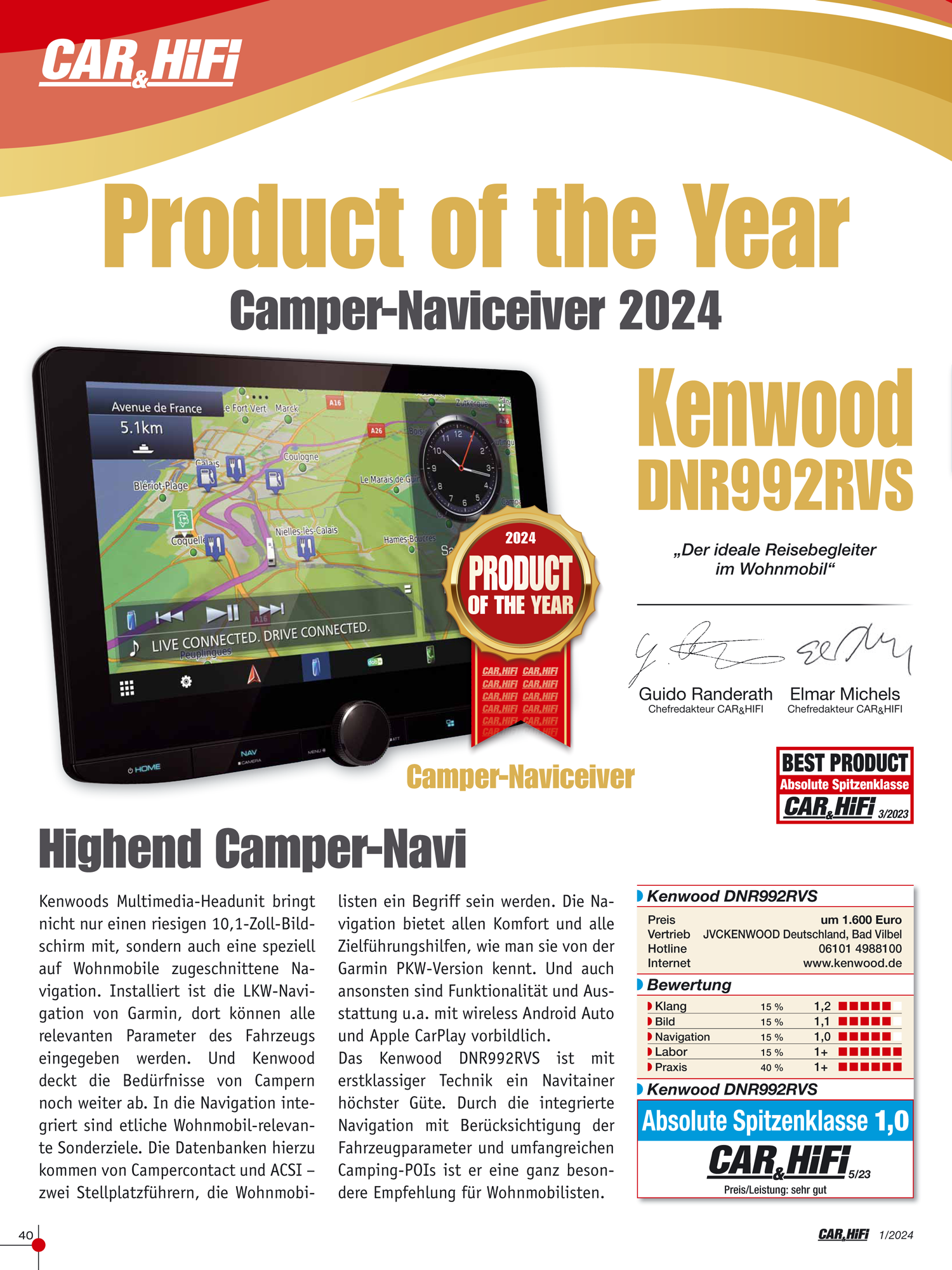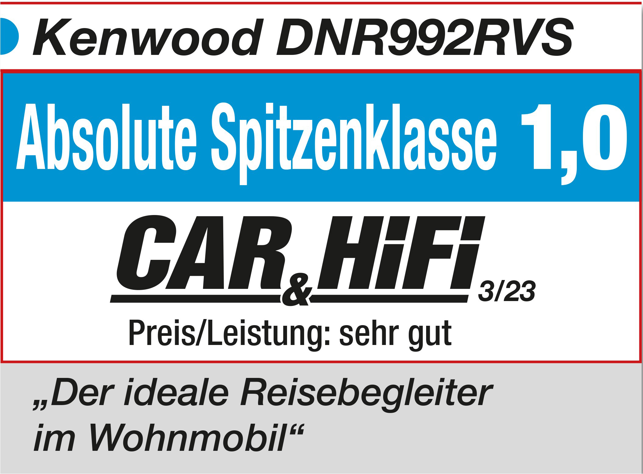 "Das Kenwood DNR992RVS ist ein Navitainer höchster Güte. Er bietet in jedem Belang Technik State-of-the-Art. Durch die integrierte Navigation mit Berücksichtigung der Fahrzeugparameter und umfangreichen Camping- POIs ist er unsere ganz besondere Empfehlung für Wohnmobilisten.“