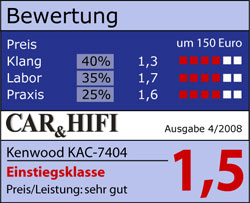 „Ganz neu bei Kenwood gibt es die KAC-7404. Den Käufer erwartet ein schwarzes Druckgusskorpus mit eigenständigem Design. (.....)