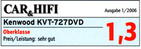 [...] Eine Besonderheit des Kenwood ist der Z-Action-Mechanismus zum Ausfahren des Monitors. [...] Bei Kenwood fährt zunächst eine Schublade aus, auf der der Monitor mit dem Display nach oben liegt. Ist sie komplett ausgefahren, so klappt der Monitor hoch und die Schublade fährt mitsamt Monitor wieder nach hinten in ihre endgültige Position. Das Ganze macht einen robusten Eindruck und lässt eine lange Lebensdauer erwarten. An der Bedienung des Kenwood ist dank Touchscreen und klarer Menüstruktur nichts auszusetzen. Bild- und Tonqualitäten sind gleichermaßen über jeden Zweifel erhaben. Mit diesen Qualitäten und der langen Liste sinnvoller Ausstattungsfeatures verdient Kenwoods KVT-727DVD das Prädikat "Testsieger".